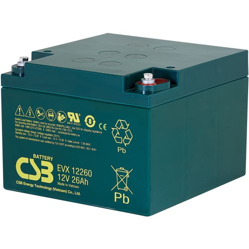 EVX12260 12V 26Ah – záložní, bezúdržbový, VRLA, uzavřený, akumulátor od CSB Battery. Technologie AGM. Určený pro cyklický provoz.