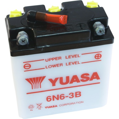 6N6-3B 6V-6Ah motoakumulátor YUASA. Motobaterie zasíláme suché přednabité. Po naplnění akumulátorovou kyselinou (není součástí balení) a ponechání cca 1 hodinu, je kapacita akumulátoru cca na 70%.