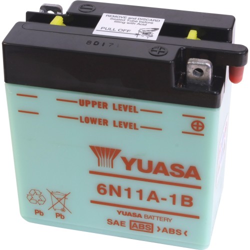 6N11A-1B 6V-11Ah motoakumulátor YUASA. Motobaterie zasíláme suché přednabité. Po naplnění akumulátorovou kyselinou (není součástí balení) a ponechání cca 1 hodinu, je kapacita akumulátoru cca na 70%.