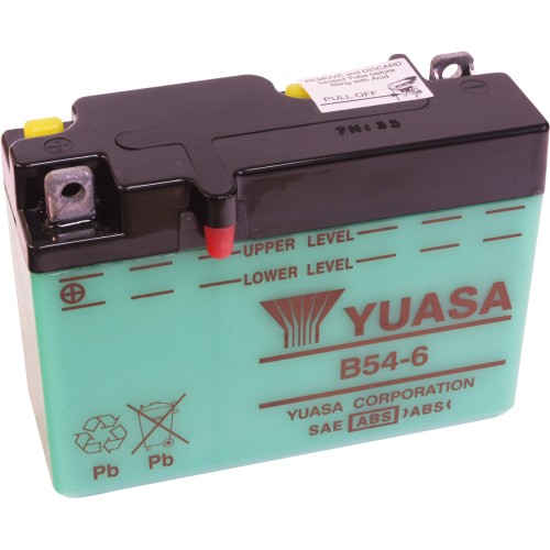 B54-6 6V-12Ah motoakumulátor YUASA. Motobaterie zasíláme suché přednabité. Po naplnění akumulátorovou kyselinou (není součástí balení) a ponechání cca 1 hodinu, je kapacita akumulátoru cca na 70%.