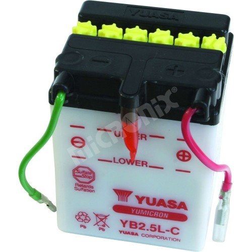 YB2,5L-C 12V-2,5Ah motoakumulátor YUASA. Motobaterie zasíláme suché přednabité. Po naplnění akumulátorovou kyselinou (není součástí balení) a ponechání cca 1 hodinu, je kapacita akumulátoru cca na 70%. Akumulátory Yumicron mají až o 30% vyšší výkon než běžné konvenční akumulátory.