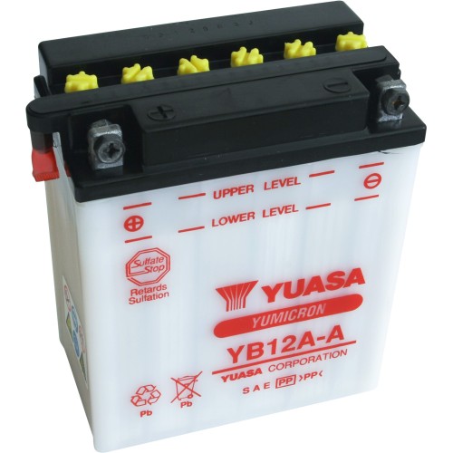 YB12A-A 12V-12Ah motoakumulátor YUASA. Motobaterie zasíláme suché přednabité. Po naplnění akumulátorovou kyselinou (není součástí balení) a ponechání cca 1 hodinu, je kapacita akumulátoru cca na 70%. Akumulátory Yumicron mají až o 30% vyšší výkon než běžné konvenční akumulátory.