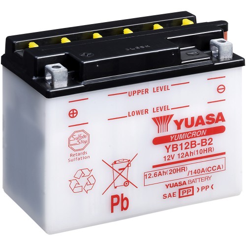 YB12B-B2 12V-12Ah motoakumulátor YUASA. Motobaterie zasíláme suché přednabité. Po naplnění akumulátorovou kyselinou (není součástí balení) a ponechání cca 1 hodinu, je kapacita akumulátoru cca na 70%. Akumulátory Yumicron mají až o 30% vyšší výkon než běžné konvenční akumulátory.