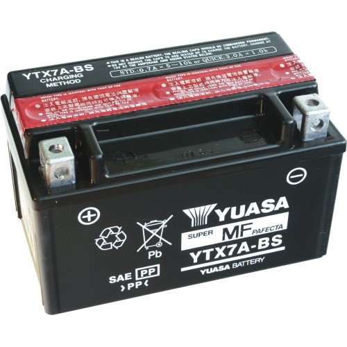 YTX7A-BS 12V-6Ah bezúdržbový VRLA motoakumulátor YUASA. Motobaterie zasíláme suché přednabité s náplní. Akumulátory MF mají o 30% vyšší startovací výkon. Bezúdržbový (MF) VRLA (bezúdržbový ventilem řízený) akumulátor YTX7A-BS nikdy nepotřebuje doplňování, avšak stále vyžaduje periodické dobíjení! Ideální pro motocykly, jízdní a žací stroje a vodní skútry.