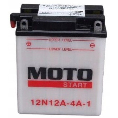12N12A-4A-1 12V-12Ah motoakumulátor MOTOSTART. Motobaterie zasíláme suché přednabité. Po naplnění akumulátorovou kyselinou (součástí balení) a ponechání cca 1 hodinu, je kapacita akumulátoru cca na 70%.