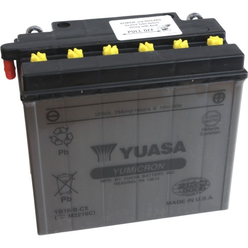 YB16-B-CX 12V-19Ah motoakumulátor YUASA. Motobaterie zasíláme suché přednabité. Po naplnění akumulátorovou kyselinou (není součástí balení) a ponechání cca 1 hodinu, je kapacita akumulátoru cca na 70%. Akumulátory Yumicron mají až o 30% vyšší výkon než běžné konvenční akumulátory.