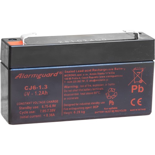 CJ6-1.3 6V 1.3Ah - záložní , bezúdržbový, VRLA, uzavřený, akumulátor značky ALARMGUARD. Technologie AGM. Určený převážně pro EZS, EPS.