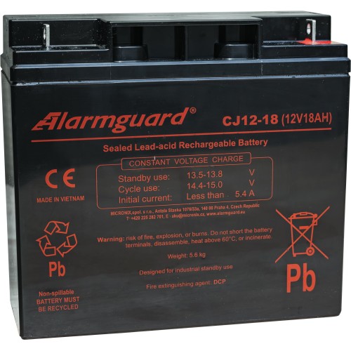 \nAkumulátory ALARMGUARD jsou bezúdržbové, uzavřené a pracující v jakékoli poloze. Optimální životnost akumulátoru CJ12-18 je 5 let ve \"Stand-by\" režimu.