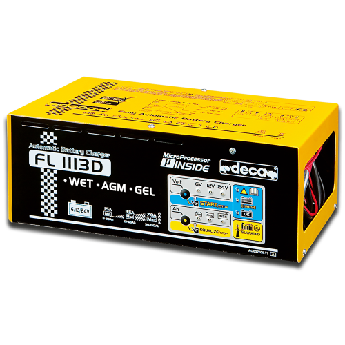 FL 1113D - Automatická mikroprocesorem řízená nabíječka 6V/12V/24V-7A. Výrobce firma DECA. Nabíječka je vhodná pro nabíjení olověných, bezúdržbových (MF), AGM a gélových akumulátorů o kapacite 8Ah - 120Ah