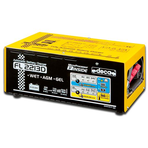 FL 2213D - Automatická mikroprocesorem řízená nabíječka 6V/12V/24V-15A. Výrobce firma DECA. Nabíječka je vhodná pro nabíjení olověných, bezúdržbových (MF), AGM a gélových akumulátorů o kapacite 15Ah - 260Ah