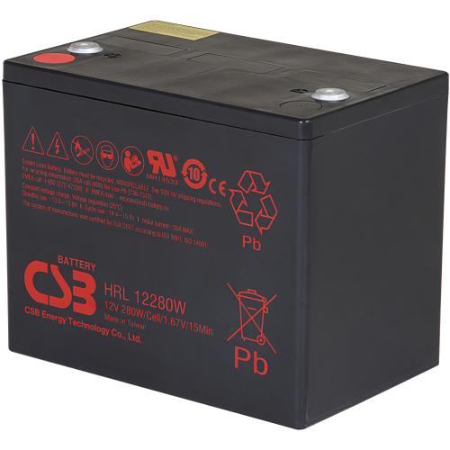 \nŘada akumulátorů HRL je speciálně vytvořena pro aplikace s vyšším stupněm vybíjení. Tato řada je vytvořena jako malá a lehká baterie, se servisní životností 8 až 10 let v režimu „Standby\" nebo na více jak 260 cyklů vybití. Díky své inovované konstrukci, se zvýšil výkon HRL řady o více jak 20% oproti ostatním porovnatelným produktům. Tak jako ostatní baterie od CSB, je i akumulátor HRL12280W/FR bezúdržbový, vysoce účinný, uzavřený a pracující v jakékoli poloze.