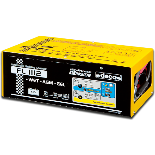 FL 1112 - Automatická mikroprocesorem řízená nabíječka 6V/12V-7A. Výrobce firma DECA. Nabíječka je vhodná pro nabíjení olověných, bezúdržbových (MF), AGM a gélových akumulátorů o kapacite 8Ah - 130Ah