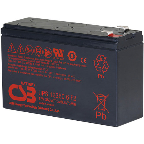 Řada akumulátorů UPS je nová generace vysokozátěžových akumulátorů speciálně vytvořena pro aplikace s potřebou maximalizovat čas dodávky vysokých proudů z akumulátoru a to díky patentovaným olověným deskám pro vysokou vodivost. Tato řada je vytvořena jako malá a lehká baterie, se servisní životností až 5 let v režimu „Standby\" nebo pro více jak 260 cyklů vybití. Díky své inovované konstrukci, se zvýšil výkon řady UPS o více jak 20% oproti ostatním porovnatelným produktům. Tak jako ostatní baterie od CSB, je i akumulátor UPS123606F2F1 bezúdržbový, vysoce účinný s nízkým samovybíjením, uzavřený a pracující v jakékoli poloze.