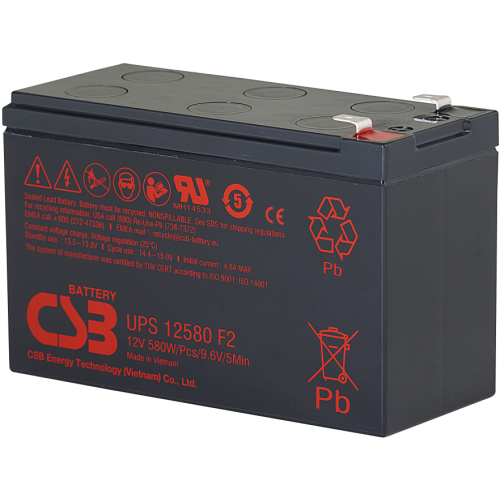 Řada akumulátorů UPS je nová generace vysokozátěžových akumulátorů speciálně vytvořena pro aplikace s potřebou maximalizovat čas dodávky vysokých proudů z akumulátoru a to díky patentovaným olověným deskám pro vysokou vodivost. Tato řada je vytvořena jako malá a lehká baterie, se servisní životností až 5 let v režimu „Standby\" nebo pro více jak 260 cyklů vybití. Díky své inovované konstrukci, se zvýšil výkon řady UPS o více jak 20% oproti ostatním porovnatelným produktům. Tak jako ostatní baterie od CSB, je i akumulátor UPS12580F2 bezúdržbový, vysoce účinný s nízkým samovybíjením, uzavřený a pracující v jakékoli poloze.