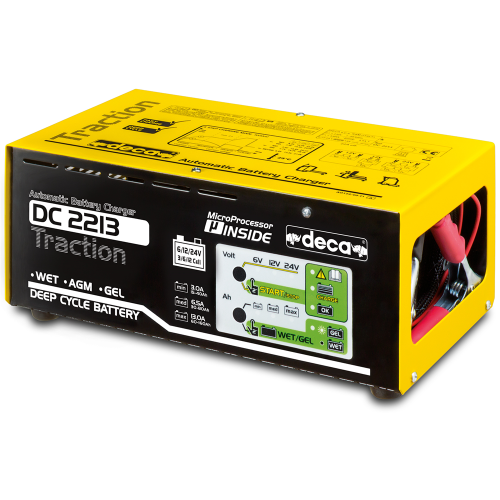 DC 2213 - Automatická mikroprocesorem řízená nabíječka 6V/12V/24V-15A. Výrobce firma DECA. Nabíječka je speciálně navržena pro nabíjení trakčních/cyklických olověných kyselinových, bezúdržbových (MF), AGM a gelových akumulátorů o kapacitě 15Ah - 160Ah