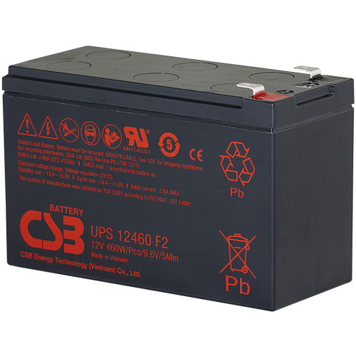 Řada akumulátorů UPS je nová generace vysokozátěžových akumulátorů speciálně vytvořena pro aplikace s potřebou maximalizovat čas dodávky vysokých proudů z akumulátoru a to díky patentovaným olověným deskám pro vysokou vodivost. Tato řada je vytvořena jako malá a lehká baterie, se servisní životností až 5 let v režimu „Standby\" nebo pro více jak 260 cyklů vybití. Díky své inovované konstrukci, se zvýšil výkon řady UPS o více jak 20% oproti ostatním porovnatelným produktům. Tak jako ostatní baterie od CSB, je i akumulátor UPS12460F2 bezúdržbový, vysoce účinný s nízkým samovybíjením, uzavřený a pracující v jakékoli poloze.