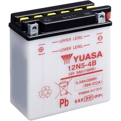 12N5-4B 12V-5Ah motoakumulátor YUASA. Motobaterie zasíláme suché přednabité. Po naplnění akumulátorovou kyselinou (není součástí balení) a ponechání cca 1 hodinu, je kapacita akumulátoru cca na 70%.