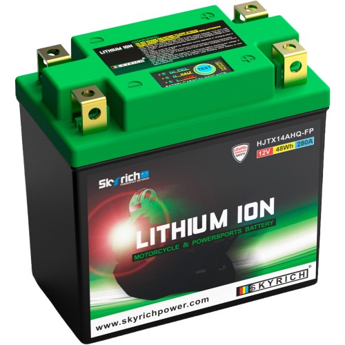 \nLithiové akumulátory Skyrich LiFePO4 jsou známé svými malými rozměry. Dodávají se s distančními podložkami pro uzpůsobení jakémukoli bateriovému prostoru v motocyklu. Při správném používání nehrozí riziko výbuchu nebo požáru, jako je tomu u jiných lithiových akumulátorů. Akumulátor HJTX14AHQ-FP je šetrný k životnímu prostředí, protože neobsahuje jedovaté kovy jako olovo, rtuť či kobalt. Neobsahuje ani kyselinu sírovou, jako je tomu u olověných akumulátorů, a proto je použitelný v jakékoli poloze, včetně \"vzhůru nohama\". Akumulátor se dodává naplněný, přednabitý, připravený k okamžitému provozu.